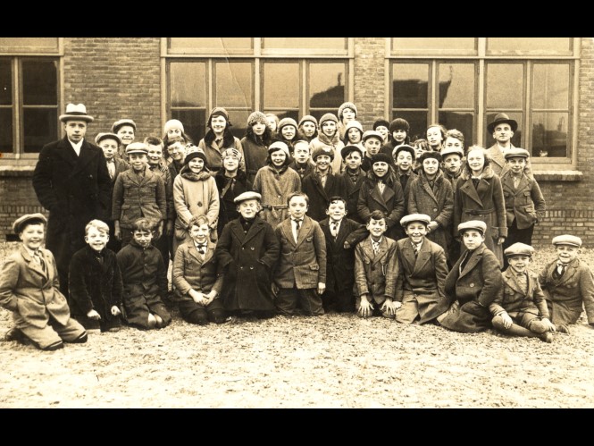 Foto: klassenfoto uit 1893, waarop meester Jacob Sturm staat. In zijn klas zit Piet Schroevers, vooraan 3e van rechts.