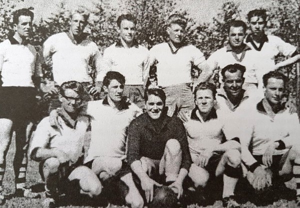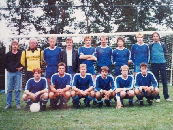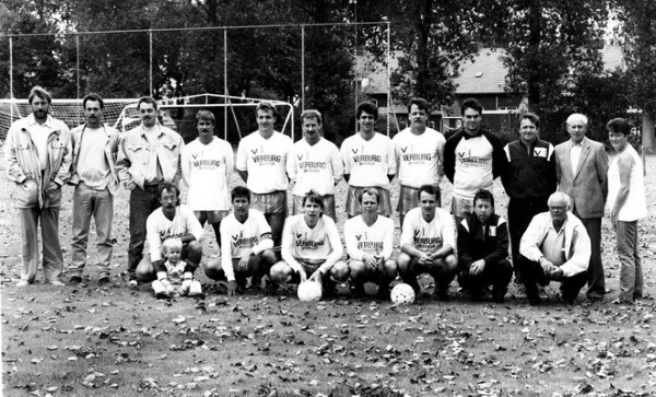 Achter vlnr. Lau Eikenhout, Jan Eikenhout, Kees Kramer, Jaap van Liere, Bram Maas, Geert Eikenhout, Kees Meulenberg, Rinus Goudzwaard, Arjaan Platschorre.
