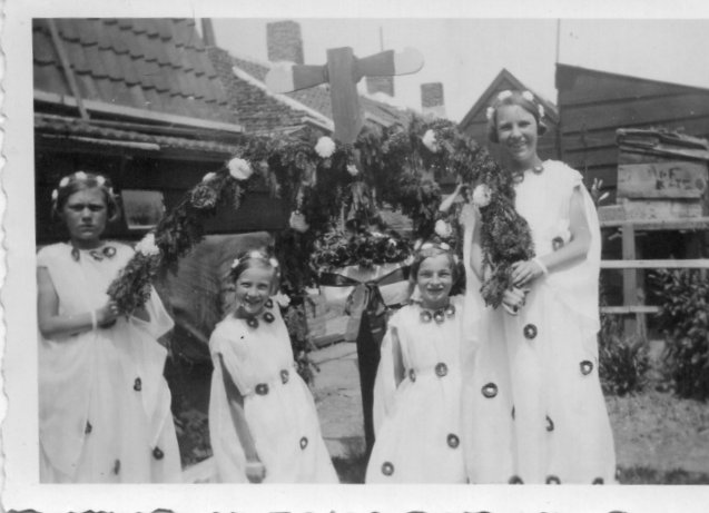 Op de 4de rij: Jaan Adriaanse, half verscholen daarachter Arjaan Platschorre, Jannetje Flipse, Pietje Korteknie, Jo Maas – de Wild , Theuna de Wild ( L.dr. ) Pietje Flipse- Clement, Sien Eikenhout , Corrie de Wild ( L. dr. ) en Pietje de Wild ( M.dr.)