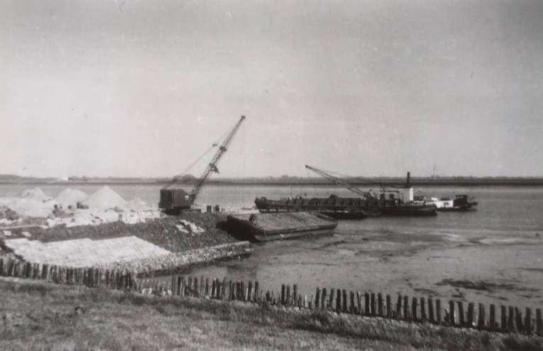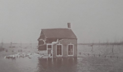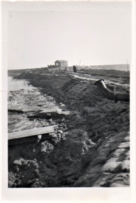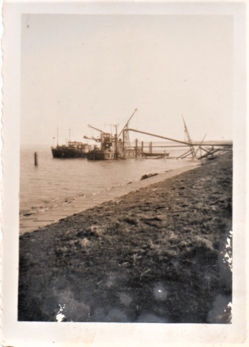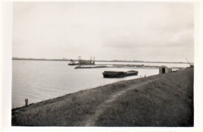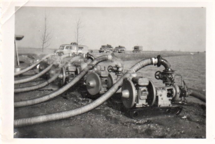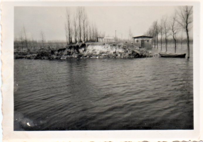 We klommen de Emelissedijk op naast de met zwarte blaken gesloten coupure en zagen water, een grote watervlakte. Ik zag van alles drijven op dat water. Stukken hout, stro, tonnen enz. Over de Oudendijk, die je hier en daar boven het water uit zag steken, lagen grote bruine buizen. Van de ene kant naar de andere. Mijn vader zei ,dat ze een polder aan het leeg pompen waren. Stil reden we terug naar huis. Ik moest huilen.