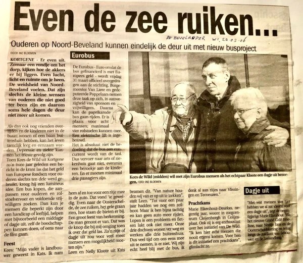 Al met al zie je dat zo’n busje contact maken mogelijk maakt. Niet alleen voor de gasten , maar ook voor de begeleiders. En zo heeft een chauffeur uit Kamperland mijn 46 jaar oude brommer gerestaureerd. Ooit gekocht bij de Wild in de Kerkstraat te Kats. Zo zie dat zulke uitstapjes de mensen van achter de geraniums haalt. Het is vaak de stap naar nog meer.