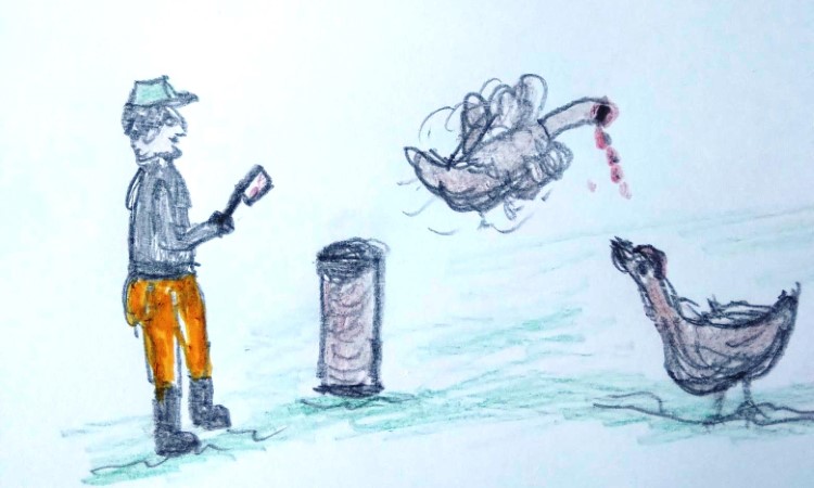 Nae even wat hewurm sloeg ie mee ’n ferme klap van ’t kapmes de kop van ’t oen. Ie hooide ’t oen zonder kop in de lucht. ’t Oen fladderde nog even en viel dan in ’t hos.
